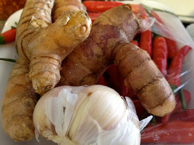 โชคดีวันก่อนที่ร้านเอาขมิ้นมาขายแล้วเลยได้ขมิ้นสดๆ มาทำเครื่องแกงส้ม รสชาติมันผิดกับเครื่องแกงกระป๋องจริงๆ เลยขอโชว์ขมิ้นสดๆ เสียหน่อยจะได้รู้ว่าชาวอลาสก้าเราก็มีขมิ้นสดกินกับเขาด้วย